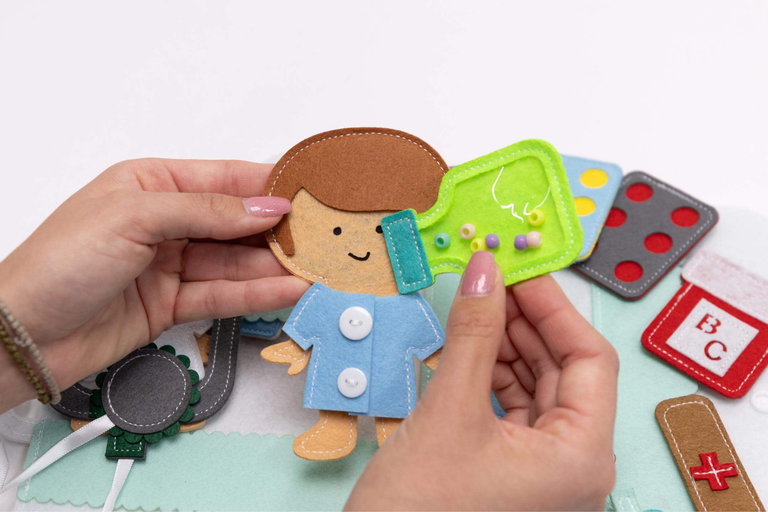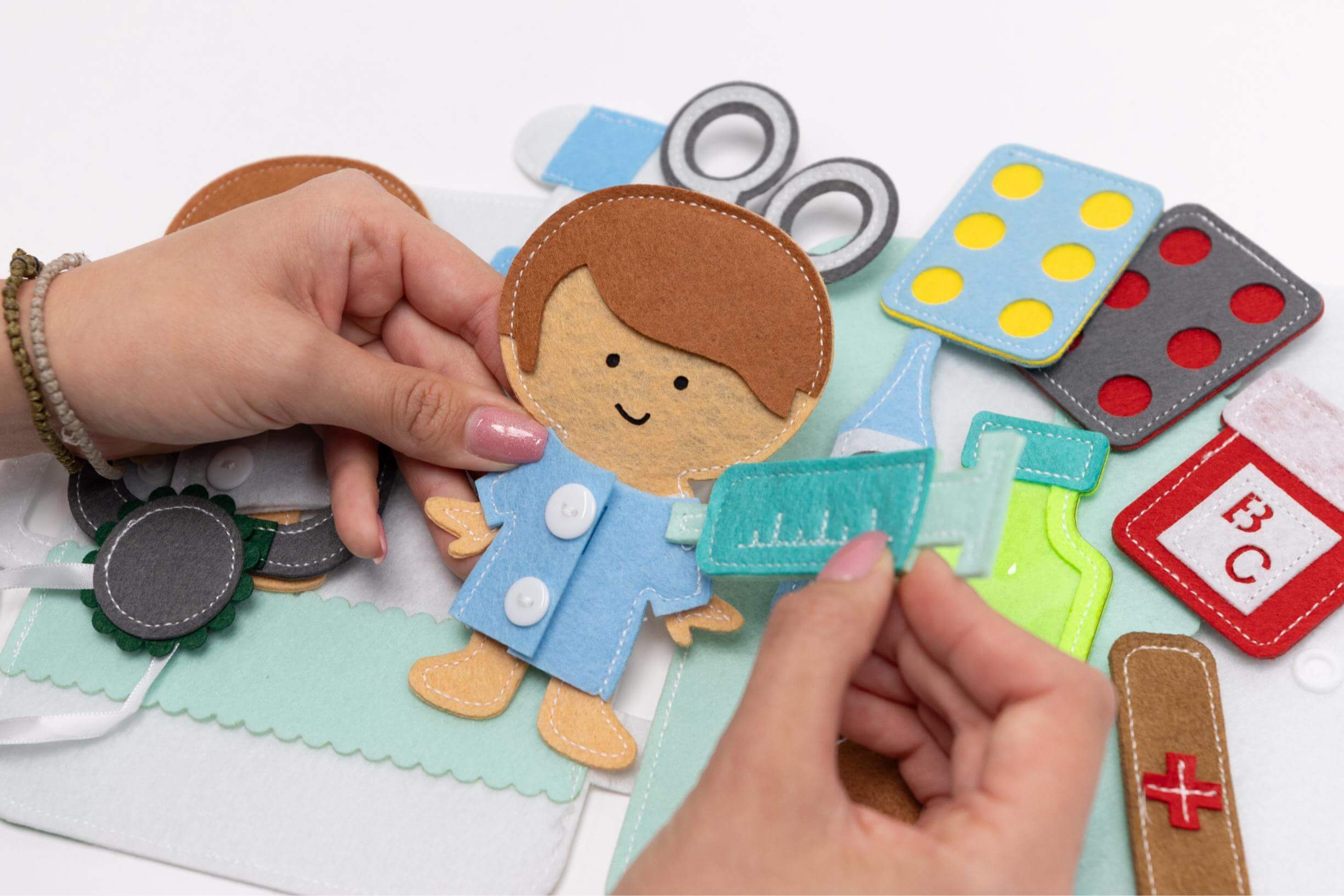 La borsa medica Smarti book è uno strumento che tornerà sicuramente utile in questo gioco. La borsa medica permette di ampliare la visione del bambino sulla missione del medico, lo incoraggia a conoscere il corpo umano e tutti gli strumenti medici e gli offre l’opportunità di imparare il primo soccorso. Il bambino può assumere il ruolo di medico e visitare il paziente, oppure passare da un ruolo all’altro, il tutto con l’aiuto dei due pupazzi in dotazione. La borsa del dottore può essere utilizzata da più bambini contemporaneamente, in modo da incoraggiare i bambini a giocare tra loro e ad aiutarsi a vicenda.