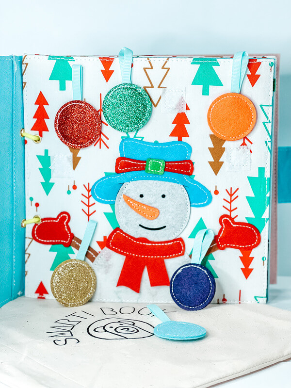 Pupazzo di neve e decorazioni: Stacca le decorazioni colorate e disponile come preferisci. Sai nominare tutti i colori? Quante decorazioni hanno lustrini? Toccale.