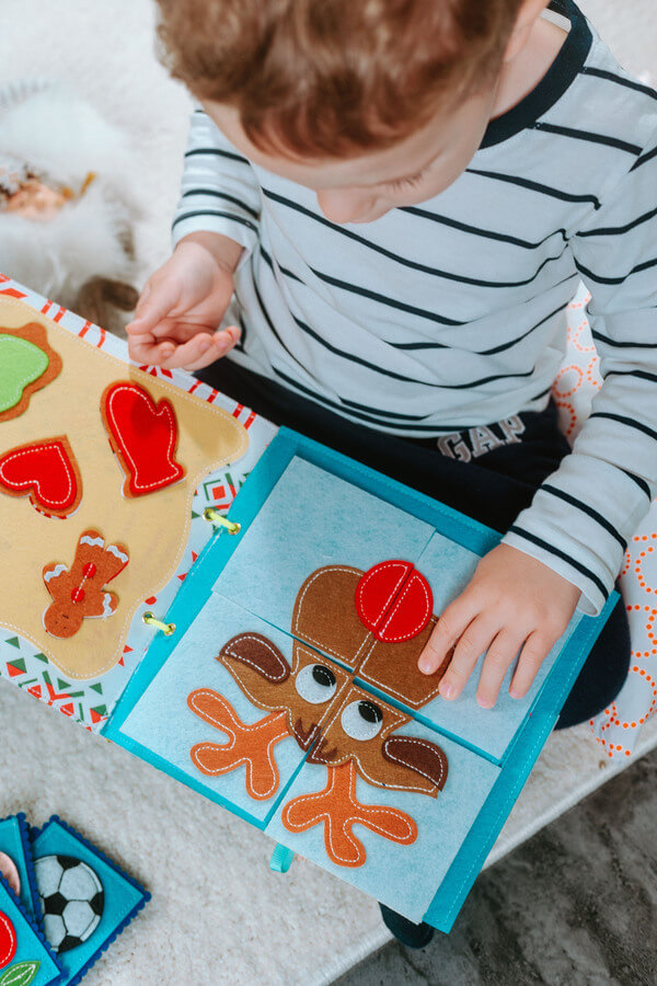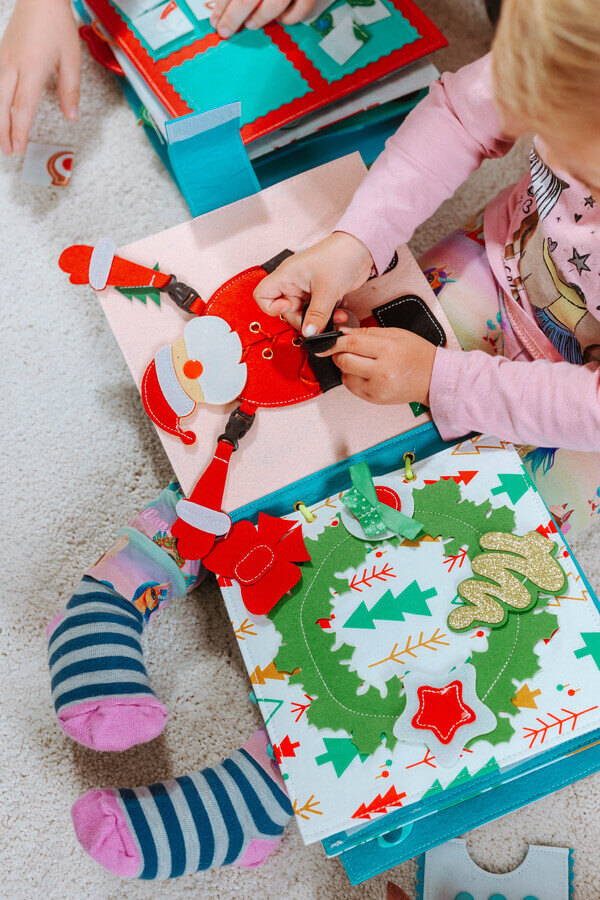 Il libro silenzioso è fatto a mano e progettato pedagogicamente. Le pagine sono rimovibili, possono essere liberamente spostate tra loro o divise tra i fratelli.