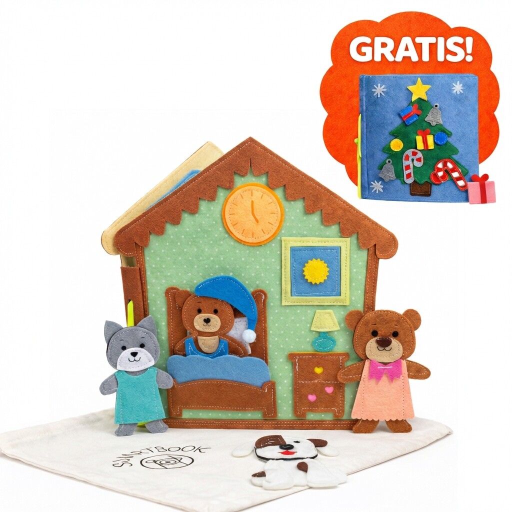 Contiene 7 pagine. Adatto a partire dai 3 anni, è progettato per incoraggiare il bambino a creare una storia con una bambola e un cucciolo come protagonisti. Contiene un’ampia varietà di piccole parti come vestiti diversi, cibo, abbigliamento ed elettrodomestici. Il bambino guida la bambola da una stanza all’altra e impara diverse faccende domestiche e si prende cura di lei. Il libro della casa delle bambole incoraggia il bambino a imparare la routine quotidiana e notturna. Con l’aiuto della bambola del libro, il bambino può prepararsi alle situazioni quotidiane, ad esempio l’igiene orale, la doccia, la preparazione dei pasti, la stiratura e il bucato, la scelta dei vestiti, il riordino e l’organizzazione del guardaroba. Inoltre, le attività scelte permettono al bambino di giocare in modo creativo e incoraggiano lo sviluppo del gioco immaginativo, che è molto importante per lo sviluppo del bambino.