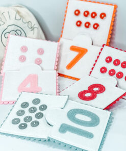 Conosciamo i numeri: Disponi le coppie di puzzle sulla superficie. Poi, con l’aiuto del conteggio dei bottoni, il bambino può imparare i numeri. È importante che conti tutti i bottoni accuratamente.