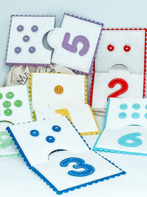 Conosciamo i numeri: Disponi le coppie di puzzle sulla superficie. Poi, con l’aiuto del conteggio dei bottoni, il bambino può imparare i numeri. È importante che conti tutti i bottoni accuratamente.