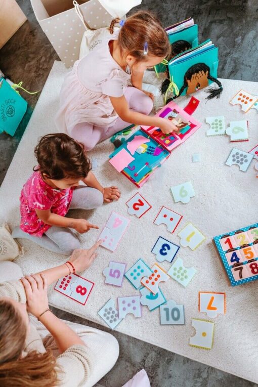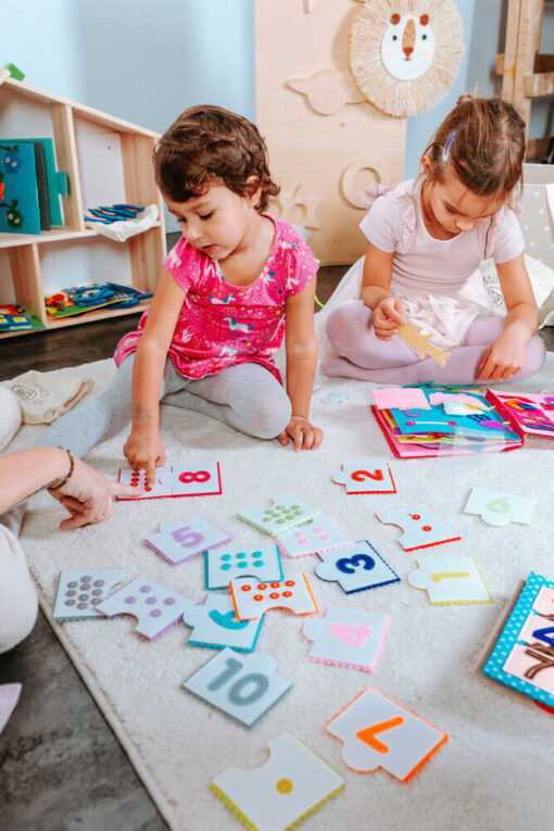 La ricerca dei numeri corrispondenti: Invita il bambino a toccare e contare i bottoni. Poi, chiedigli di cercare il numero corrispondente sull’altra metà del puzzle. Una volta completato il puzzle, chiedi al bambino di verificare nuovamente la correttezza del risultato.